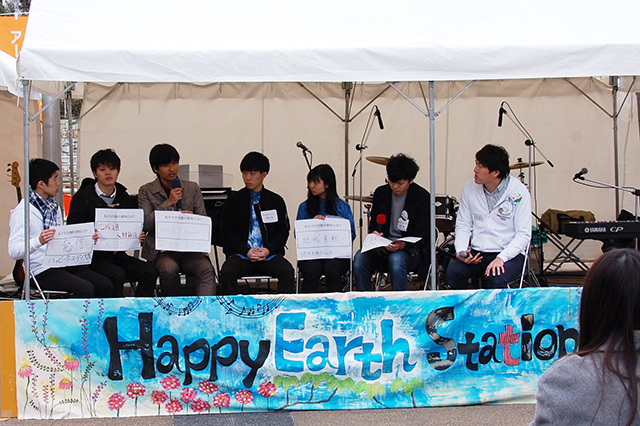 大学生のスタッフ達が司会者に鋭い質問をされているトークショーでした。