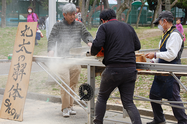 丸太の解体ショーやってました!ブイーーンとエゲツナイ音して丸太をスライスしてました。